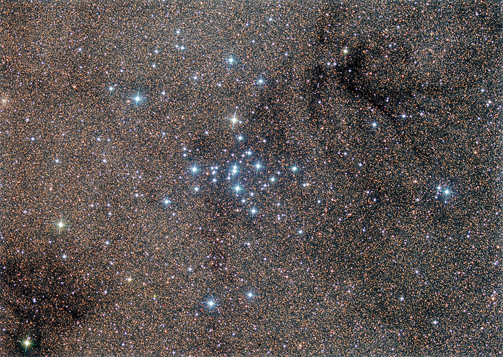 clusters of stars on the sky. The cluster, dominated by bright blue stars, can be seen with the naked eye in a dark
